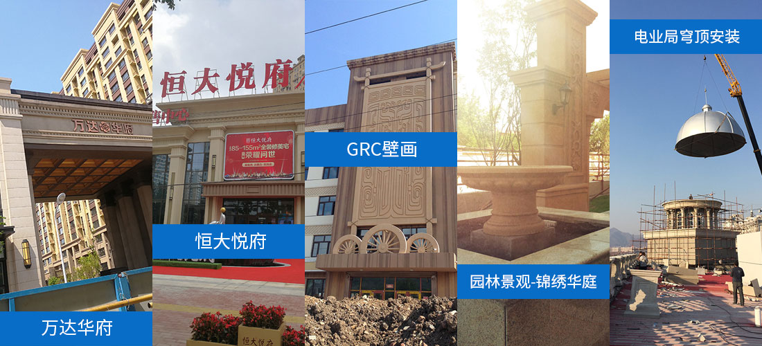 本企業(yè)的產品被廣泛應用于建筑室內及外墻的裝飾、裝修工程和市政、園林景觀的造景等。主要產品有檐線、門窗裝飾線、穹頂、扶手墩、山花、浮雕裝飾板、中式西式的傳統(tǒng)裝飾、歐式羅馬裝飾柱、仿蘑菇石、仿剁斧石、仿干粘石、假山、噴泉、圓雕、藝術壁畫、外墻掛板、室內石膏線、燈盤、浮雕、羅馬柱等。均可根據(jù)客